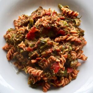 Pasta di lenticchie rosse con broccoli al pomodoro